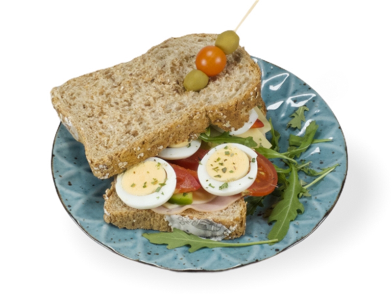 Belegd broodje/boterham met jong belegen kaas, achterham, rucola sla, tomaat, komkommer, ei