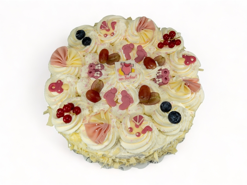 Slagroomtaart met geboorte opmaak voor Jongen of Meisje. De taart is niet gesneden en voor +/- 12 personen.